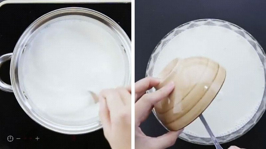 Bước 1: Đun sữa tươi với sữa đặc, khuấy đều tay tránh cho sữa bị khê. Đun sữa đến khi sôi lăn tăn thì tắt bếp. Để sữa nguội khoảng 50 độ (nếu không có nhiệt kế, kiểm tra bằng cách nhỏ sữa lên tay, cảm thấy ấm, không phỏng là được).