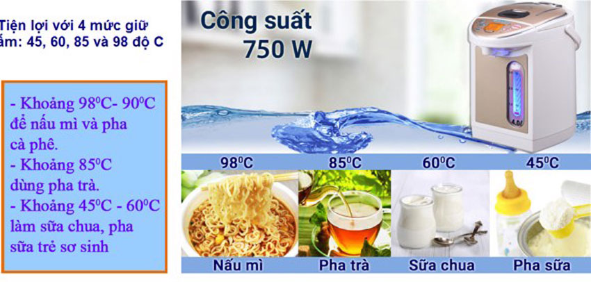 Bình thủy điện có nhiều mức nhiệt độ giữ ấm khác nhau cho phép người dùng lựa chọn như: 45 – 60 -85 -98 độ C, giúp bạn luôn có sẵn nước nóng để pha sữa, pha cà phê, phê trà hay nấu mì.