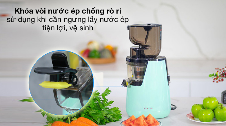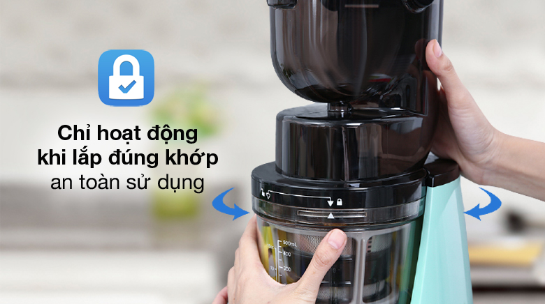Máy ép chậm Kalite chỉ hoạt động khi lắp đúng khớp và tự ngắt điện khi quá nhiệt hay nguyên liệu quá tải, đảm bảo an toàn cho người dùng.