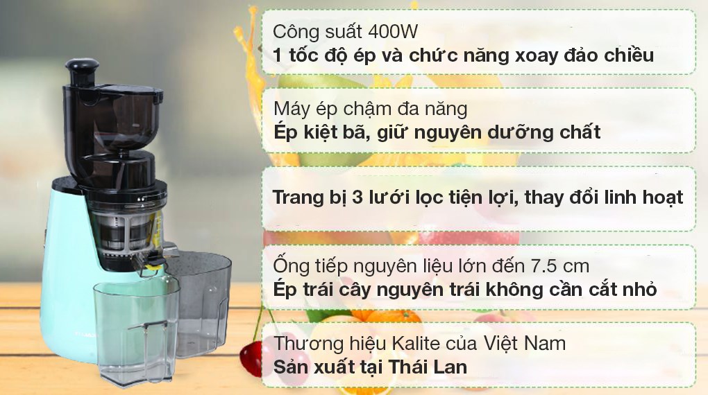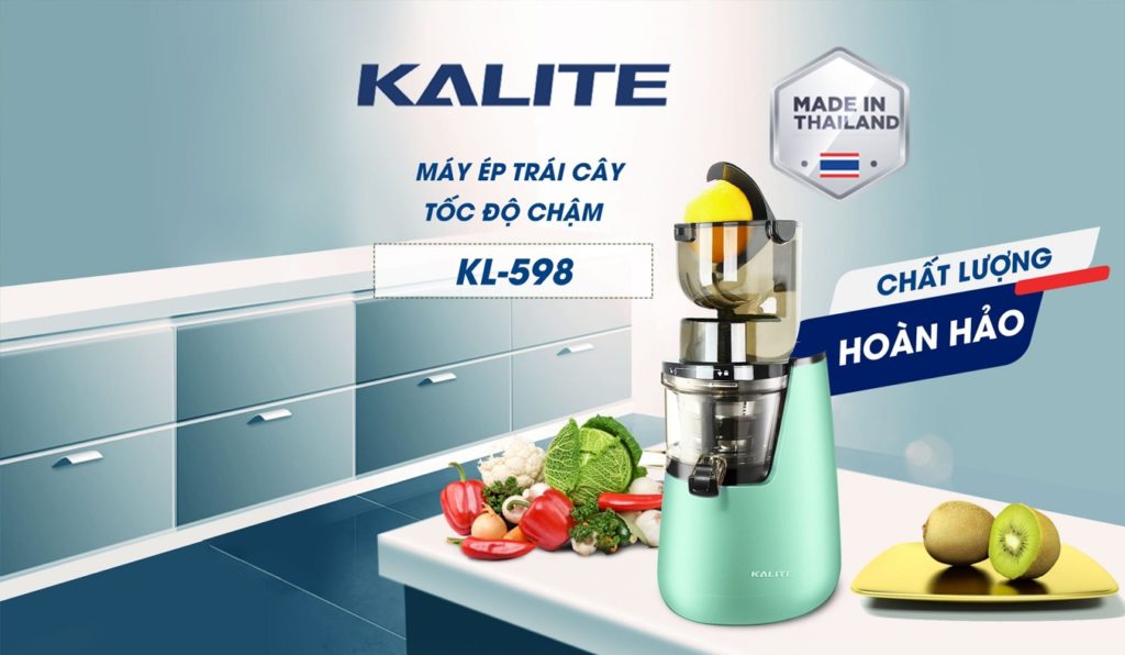 Máy ép chậm Kalite KL-598 thương hiệu Kalite uy tín của Việt Nam, sản xuất tại Thái Lan, là sự lựa chọn tin cậy cho mọi gia đình với thiết kế đẹp, an toàn sử dụng, ép nước nhiều, giàu dưỡng chất.