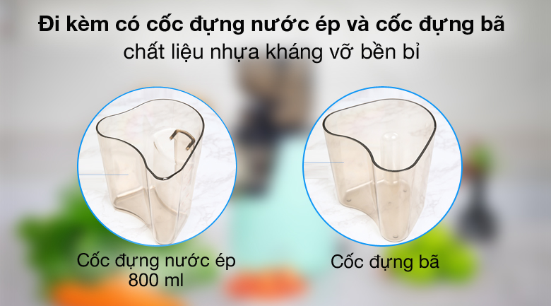Dung tích 800 ml chứa được nhiều nước ép cho 1 lần dùng, Kèm thêm cốc đựng bã lớn tiết kiệm thời gian tạm ngưng để đổ bã.