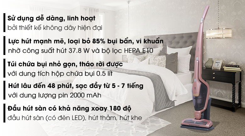 Máy hút bụi sử dụng pin HD lithium giúp tối ưu sức mạnh dọn dẹp với thời gian sử dụng lên đến 48 phút, có đế sạc riêng biết, dễ lắp đặt, giúp bạn tiết kiệm chi phí điện hàng tháng cho gia đình. Đặc biệt, thời gian sạc pin khoảng 5 – 7 giờ, tích hợp đèn báo giúp bạn dễ dàng kiểm soát lượng pin mà máy đang sạc.
