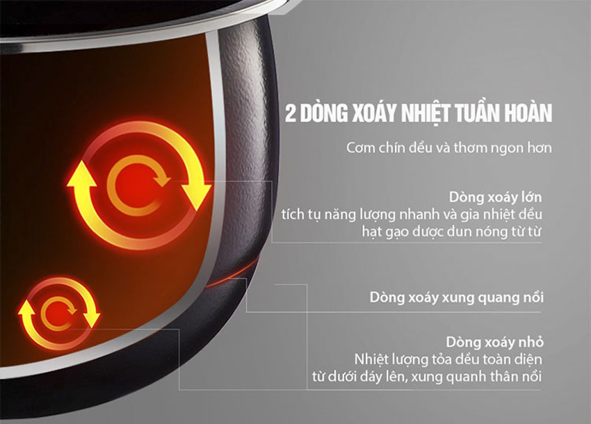 Hai dòng xoáy nhiệt tuần hoàn: Dòng xoáy lớn có khả năng tích tụ năng lượng nhanh và gia nhiệt điều hạt gạo được đun nóng từ từ.