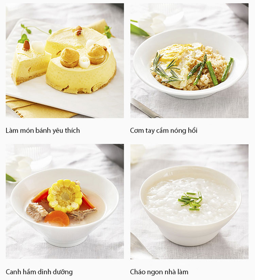 Như đã nói, nồi cơm điện tử Joyoung F-50FY13 ngoài nấu cơm còn có chức năng nấu cháo, soup, làm bánh, nấu nhanh, nấu chậm, nấu các loại gạo khác nhau… với các chế độ nấu được cài đặt trước giúp món ăn chế biến đơn giản hơn, nhanh gọn mà đảm bảo thơm ngon.