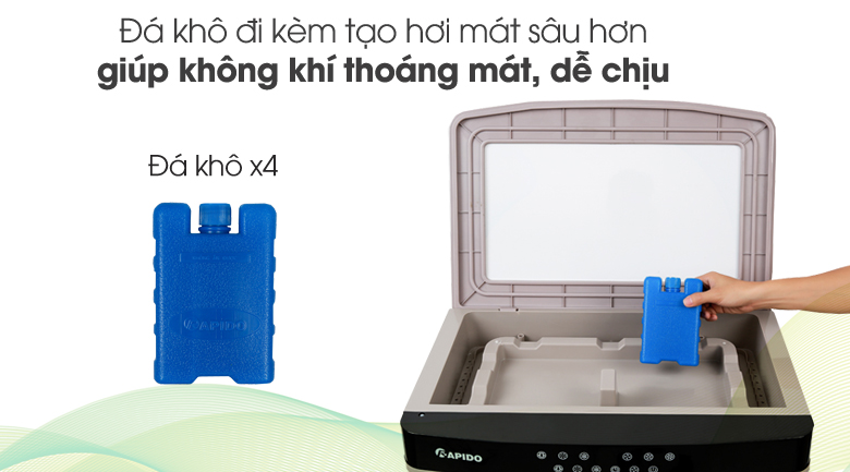 Quạt điều hòa đi kèm quạt có 4 cục đá khô giúp tăng hiệu quả làm mát trong ngày nắng nóng cao độ. Để sử dụng, chỉ cần cho vào ngăn đá tủ lạnh để làm lạnh trước khi cho vào bình chứa nước của quạt sẽ giúp hơi nước thoát ra mát mẻ hơn, tăng hiệu quả giải nhiệt.