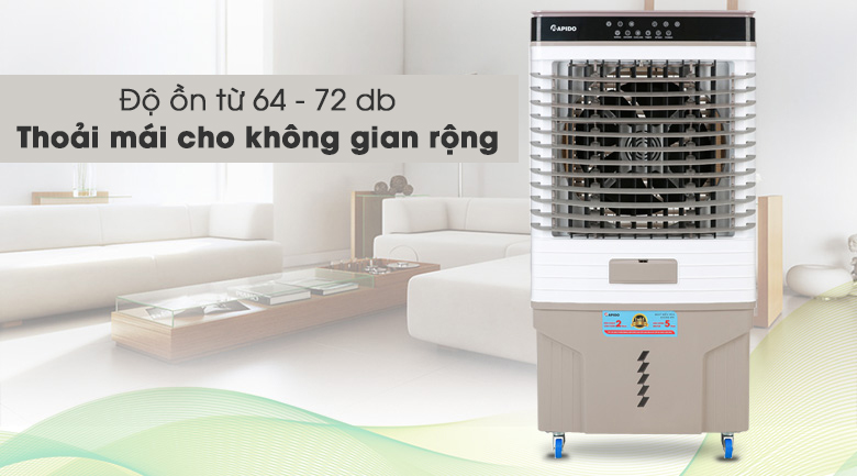 Quạt vận hành với độ ồn từ 64 – 72 dB, tương đương với âm thanh trong siêu thị hay văn phòng khi ồn ào, đủ thoải mái để sử dụng cho các không gian rộng