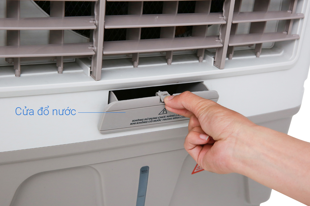 Khi bình chứa nước không có nước, nếu người dùng chọn chế độ làm mát, quạt vẫn hoạt động bình thường, không có đèn cảnh báo, muốn vệ sinh bình chứa, bạn thoát nước bằng van xả dưới đáy bình chứa nằm ở giữa 2 bánh xe sau.