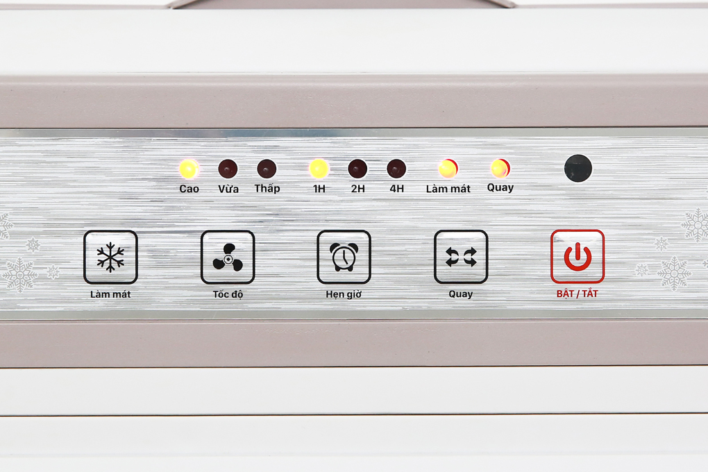 Hẹn giờ tắt/ Có thang đo hiển thị mực nước/ Có van xả cặn khoang chứa nước/ Có vòi cấp nước trực tiếp liên tục/ Đảo chiều gió bằng tay lên – xuống, tự động trái – phải/ Có hộp đá khô làm mát/ Có bánh xe di chuyển
