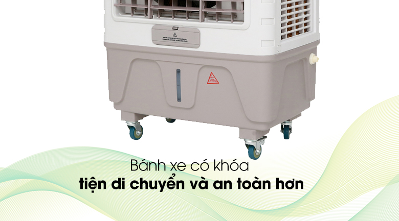 Ngoài ra, quạt hơi nước còn có 04 bánh xe nên rất dễ dàng di chuyển quạt hơi nước từ vị trí này sang vị trí khác thuận lợi, 2 bánh xe có khóa giúp cố định vị trí của quạt khi chúng ta không muốn quạt bị xê dịch đi nơi khác